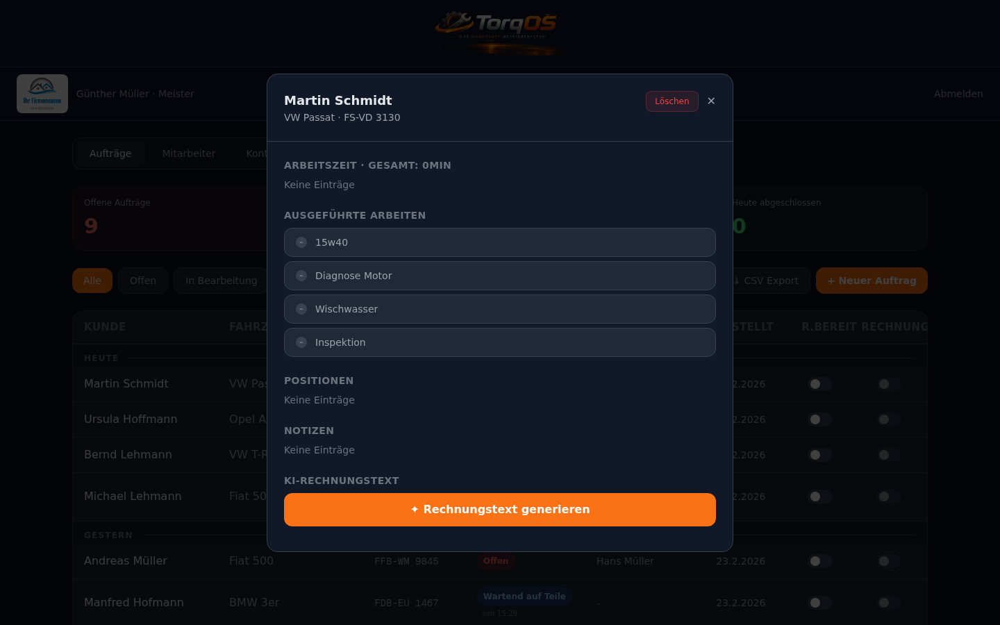TorqOS digitalisiert deine Werkstatt – von der Auftragserfassung bis zur Rechnung. Schnell, sicher und ohne IT-Kenntnisse.